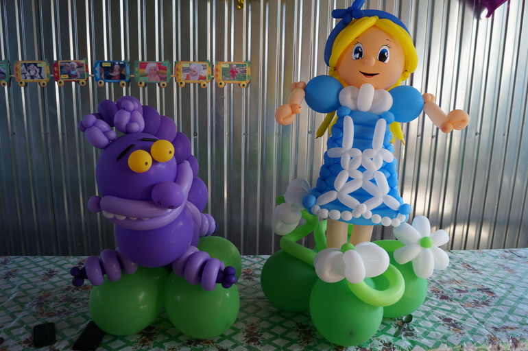 Праздник было решено отмечать дома у моих родителей во дворе,у них хороший навес и даже в случае дождя он нам бы был не помеха. Приготовления по украшению "зала" были минимальны. Заказали фигурки Алисы и кота из страны чудес и радугу.