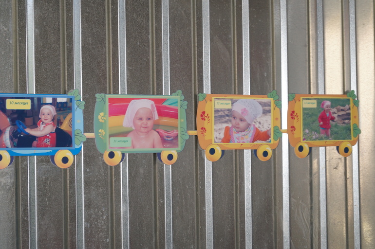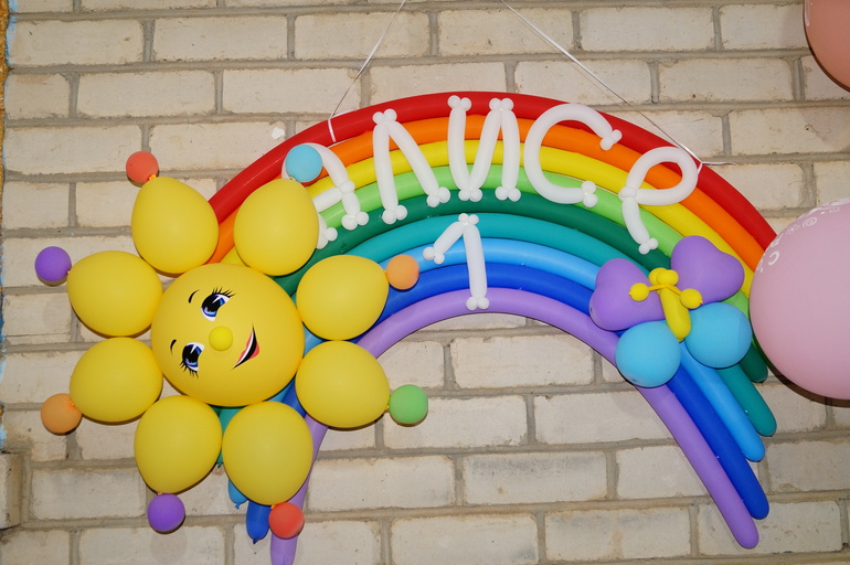 Украсили двор шарами.Я делала сама растяжки, поезд времени.