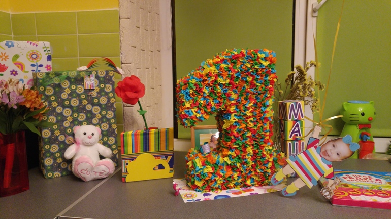 Единичка с трёх сторон декорирована, с задней стороны - просто гофробумага.