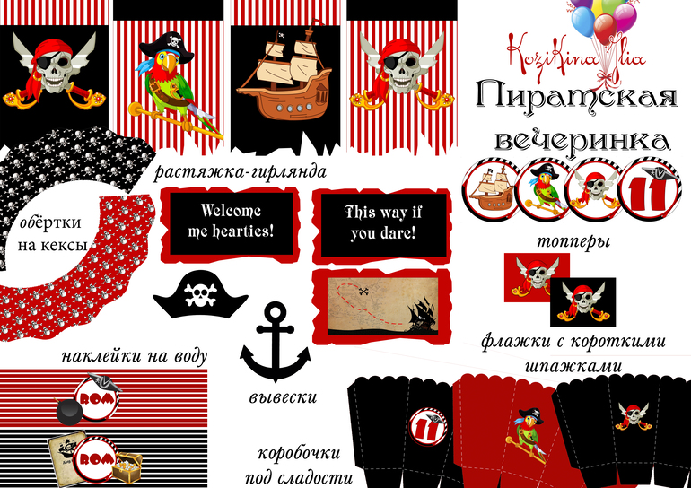 Предлагаю свои услуги!Здравствуйте! Вошел новый набор Пират. В набор входят растяжка, топперы, флажки, обертки на кексы, наклейки на воду, коробочки под сладости, вывески.