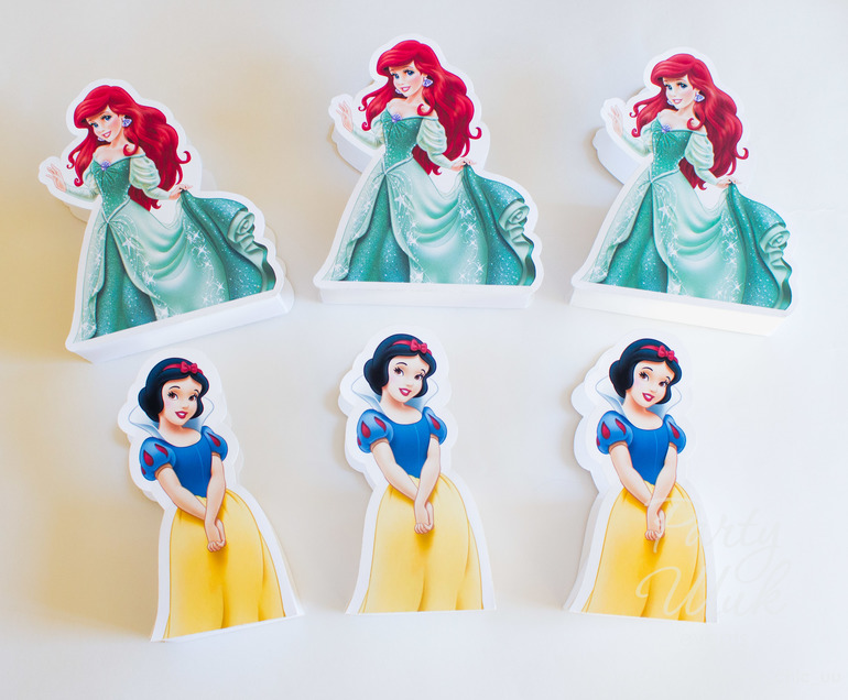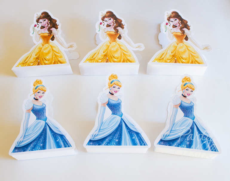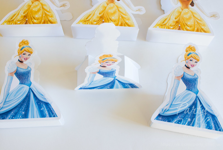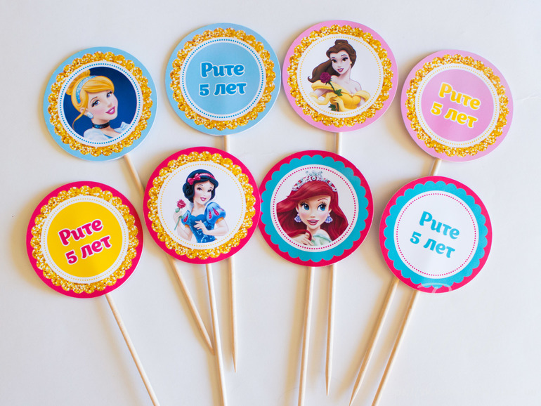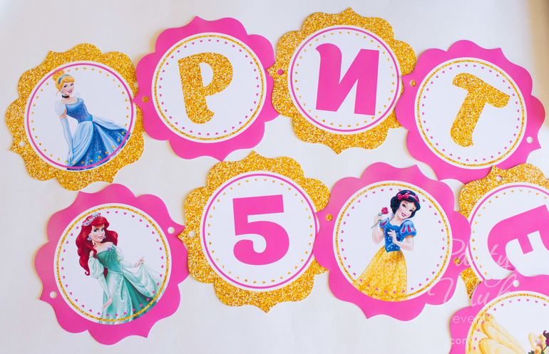 Именная поздравительная растяжка, топперы и коробочки-бонбоньерки для сладкого подарка гостям. Всё в тематике "Принцессы Диснея".