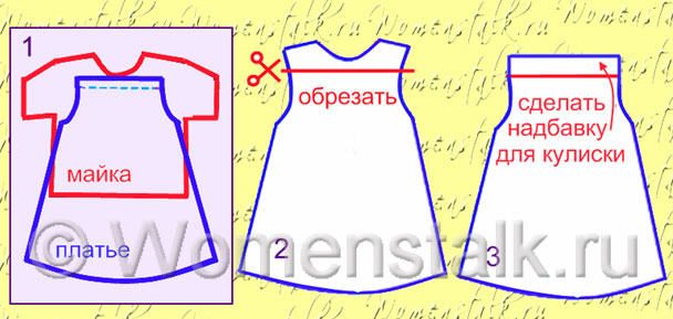 Или обведите майку вашего ребенка и от руки нарисуйте поверх контуров майки наше будущее платье. Контуры майки будут служить вам меркой - так вы нарисуете платье нужного вам размера. Как добиться симметричности детали, читайте в вышеупомянутой 1-ой части статьи, или в предыдущей 8-ой части, - я уже не буду повторяться. И не забудьте сделать припуски на швы (в шаблоне, я напомню, они уже учтены)