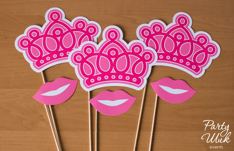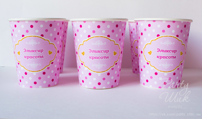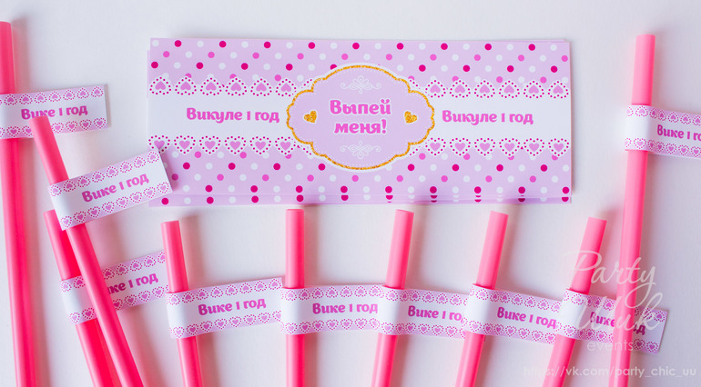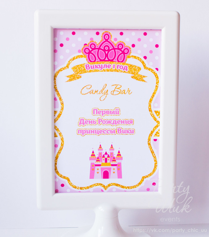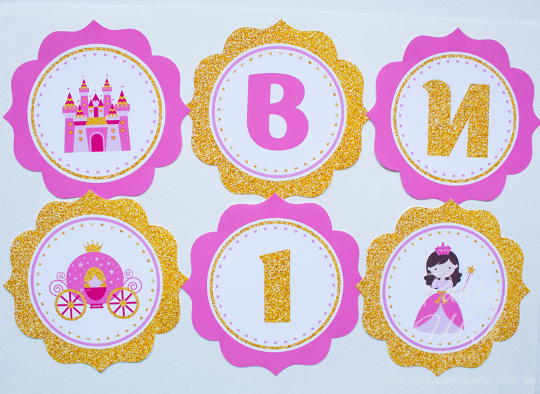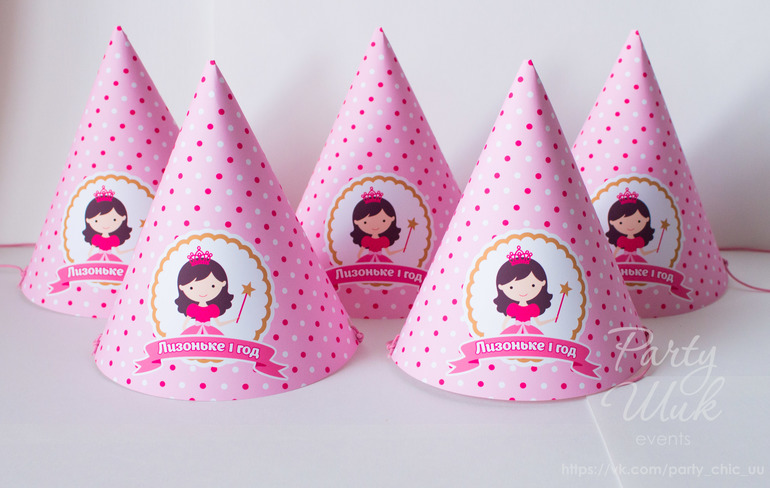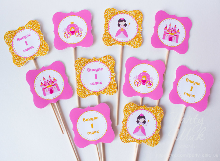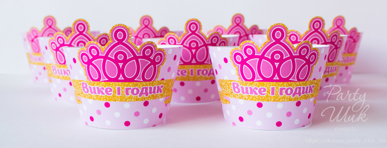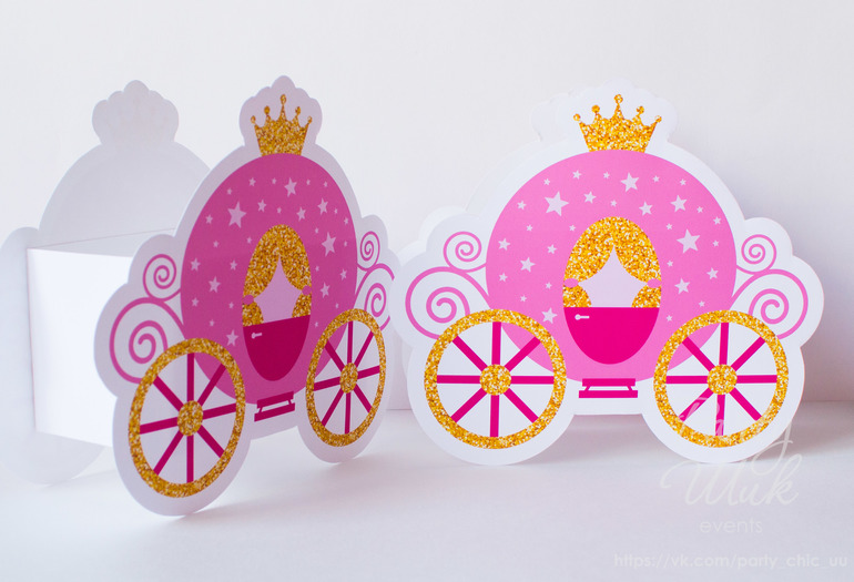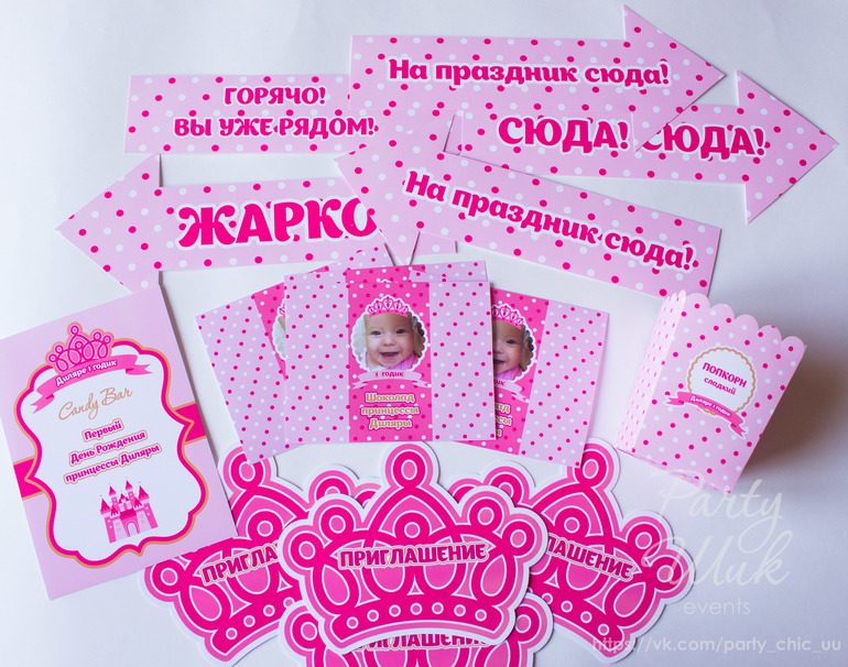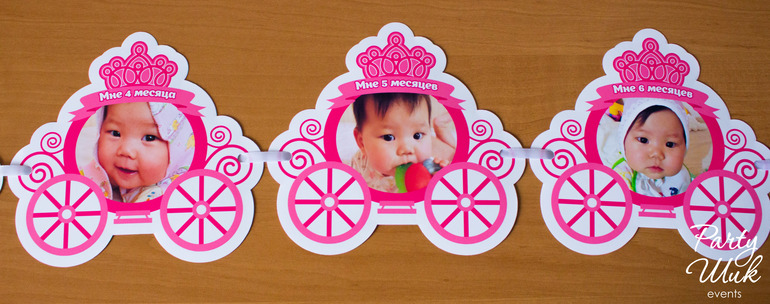 В набор также входят колпаки, коробки для попкорна, фоторастяжка от 1 до 12 мес. в форме карет, кейк-топпер в виде веерного круга на палочке, масочки для фотосессии и стрелки-указатели на праздник, их мы тоже можем разработать в розово-золотой гамме:![]()