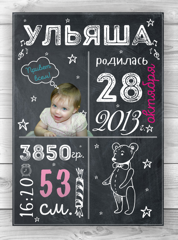 а еще у меня появилась новинка- Именной постер(метрика), имитирующий меловую доску.На таком постере можно написать не только метрики, но и события за первый год жизни,картинки могут быть любые по вашему желанию( в тему набора для оформления праздника). Такой постер станет отличным украшением детской на рождение малыша.Цена до конца месяца всего 100р в электронном виде.Напечатать его можно в любом фотоателье на плотной матовой фотобумаге