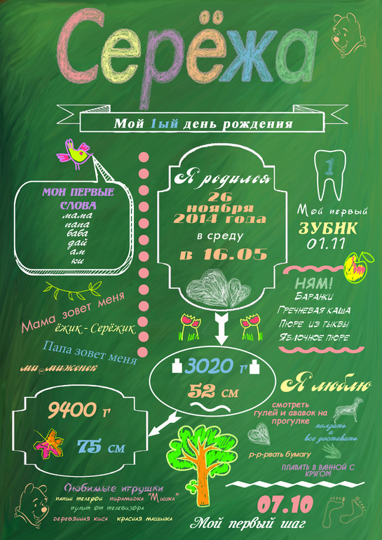 Фотошоп. Надо просто кисти установить. Они, по-моему, charge называются, ну в переводе мел. Плюс шрифты разные накачала. Некоторые элементы векторные скачала, некоторые сама при помощи стандартных фигур фотошоп сделала, но с меловой обводкой. Делала на годик сыну. Тема у нас была Винни. Вот вышло как-то так.
