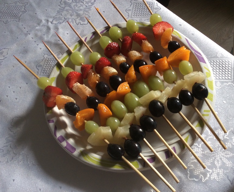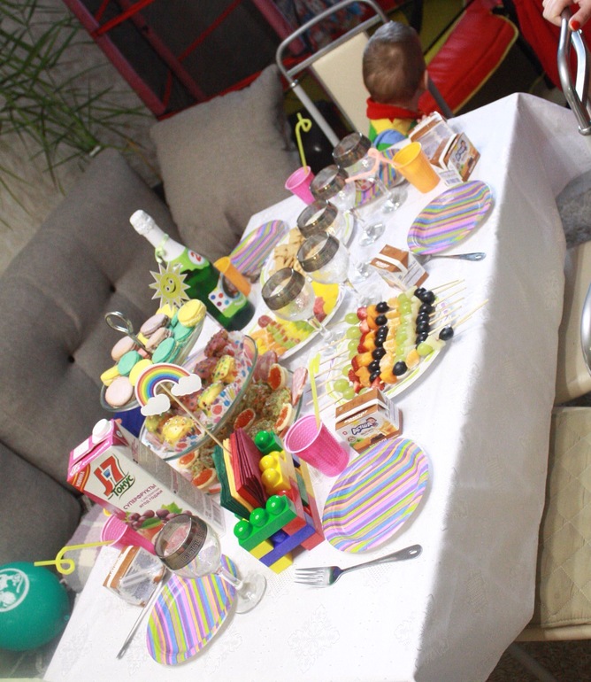 Стол был детский в этот день, без горячего. Макаруны, кексы, тарталетки с салатиком и икрой, шпажки с фруктами, печенье, торт, компот