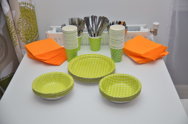 Да от трубочек я уже отказалась) решила что тарелки и стаканы будут оранжевые, а салфетки зеленый горох