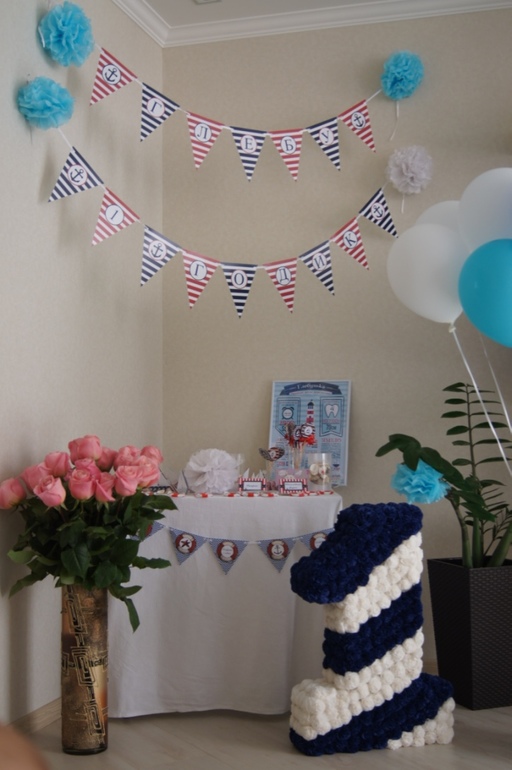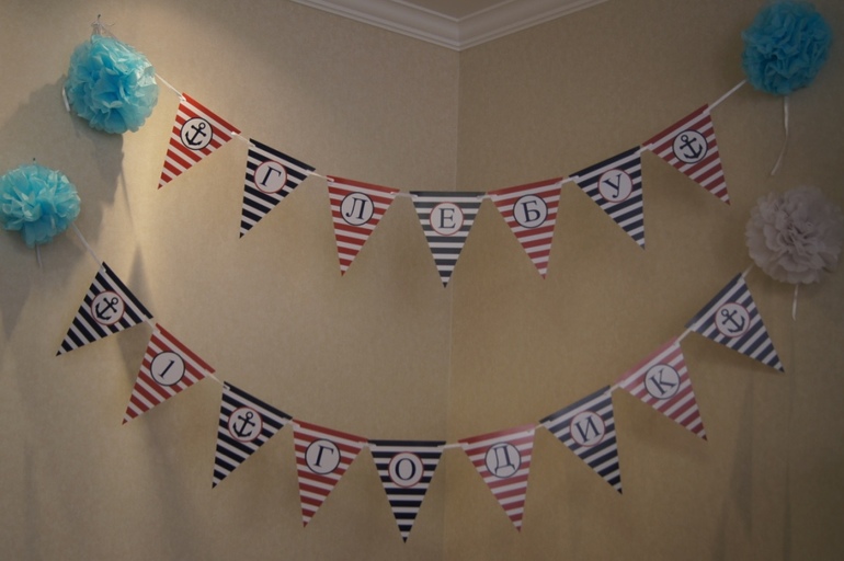 Также сама сделала гирлянду, бумажные топперы, таблички к сладостям, кораблики и спасательные круги (спасибо бэбиблогу!)