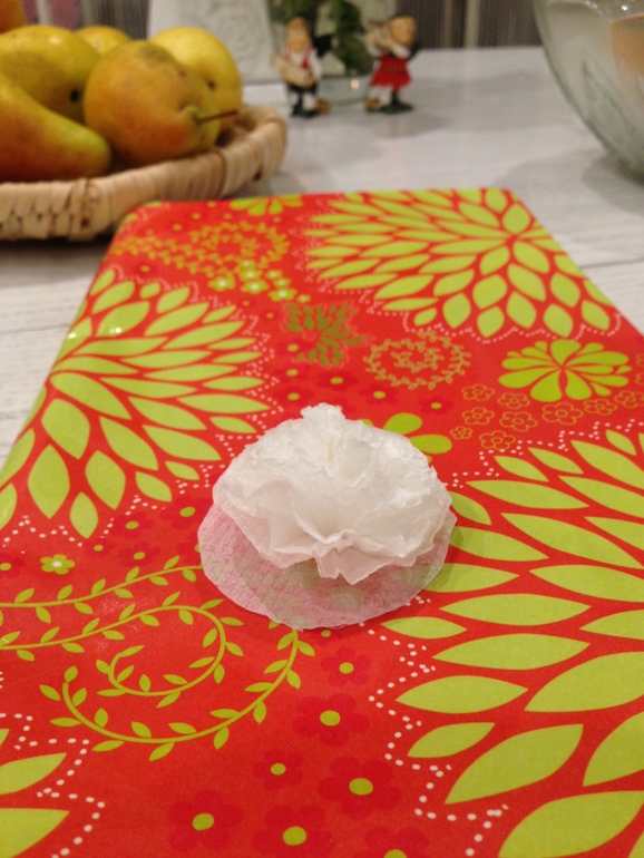 Салфетку складывала два раза (в квадрат), посередине скрепляла степлером, вырезала кружок, и потом распушевывала каждый слой, сминая по центру.