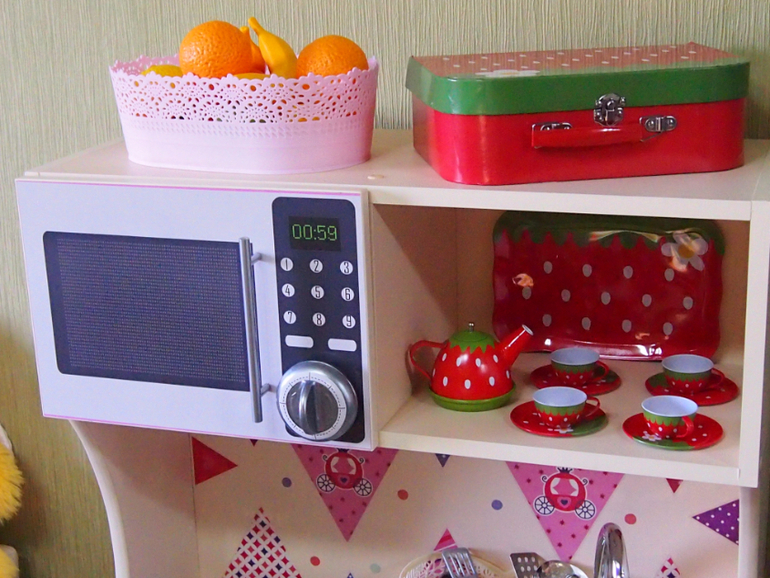 Сам каркас кухни сделал муж крестной по моему эскизу (он занимается изготовлением мебели). У меня была задача превратить короб с дверками в кухню)))) Итак, я замерила дверки и нарисовала в фотошопе варочную панель, духовку, микроволновку и наклейку на ручку микроволновки, напечатала все на самоклеющейся пленке и приклеила. Ручка включения микроволновки это икеесский таймер, покрашенный серебряным акрилом, он тикает и звенит, что делает его очень похожим на сигнал готовности еды в микроволновке)