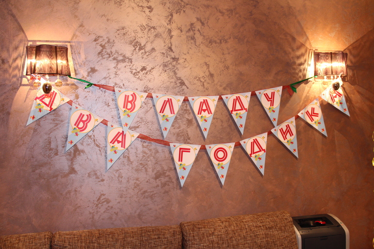 именные растяжки, распечатанные этикетки на шоколадки и соки (несколько штук), распечатанные фоторамки.
