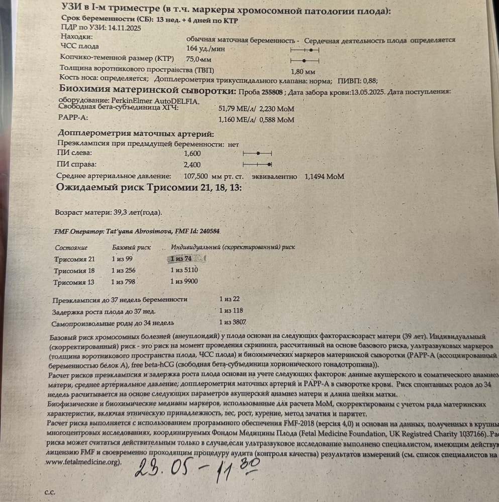 Через неделю после скринингового УЗИ раздался тот самый звонок из генетики, которого хоть и не ждала, но где-то внутри была к нему готова( Сообщили, что по крови индивидуальный риск трисомии 21( Синдром Дауна) 1:74… Конечно, страшно,но возраст 39 лет, стоило ожидать😔Сразу поехали сдали НИПТ, теперь 2 недели ожидания. От амниоцентеза пока написали отказ, дождёмся анализ крови.Врач на приёме была немногословна, задала дежурные вопросы и отпустила. Тревожно, но я держусь и верю, что моя крошка здоровенькая🙏🏻