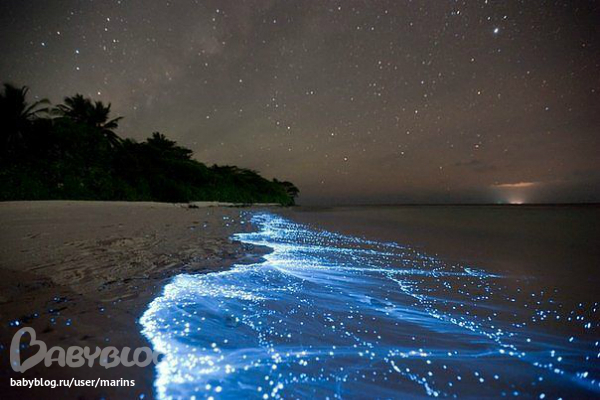 Светящийся планктон на пляже острова Ваадху, Мальдивы