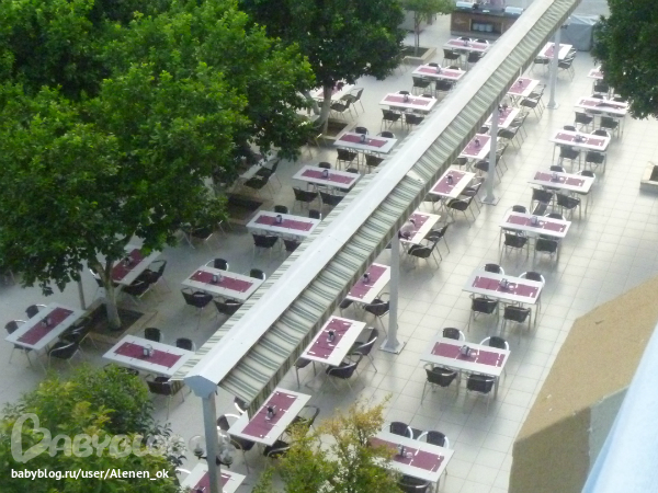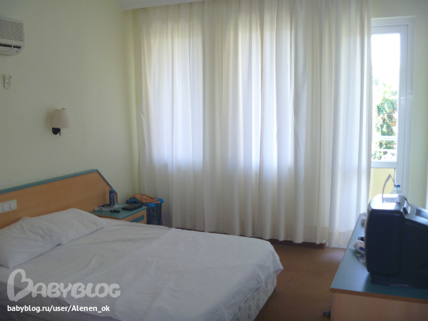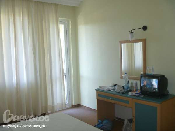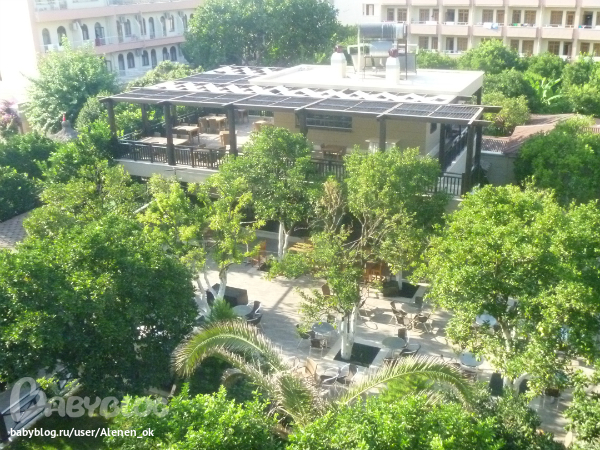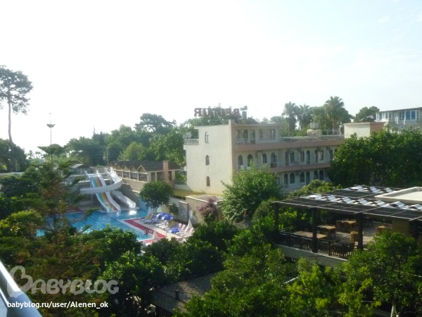 Вид из номера на территорию отеля, море, горы и бассейн! Жара была жуткая (+37), ночью +27, спасал только кондиционер!