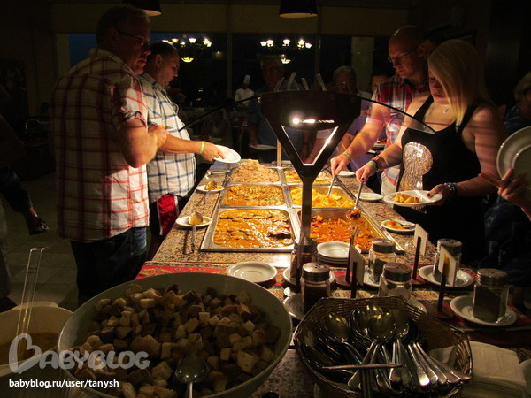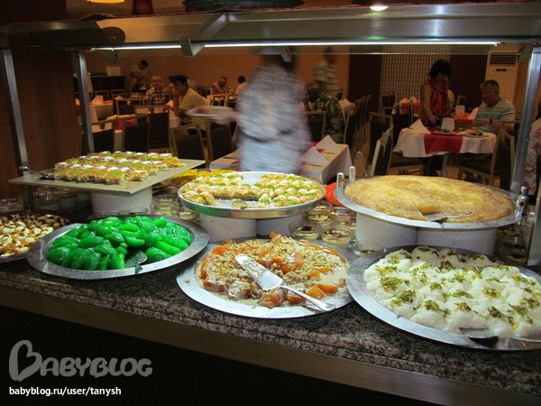 Девочки, какое там питание!!!! Мама дорогая!!! Сколько там было всего!!! И мясо ( индейка, курица, баранина, говядина), рыба, овощи всякие разные - и тушеные, и маринованные, и жареные, и пареные, морепродукты были по пятницам, но в огромном количестве! А сколько салатов!!! А какие сладости!!! Только на обед было 4 торта + штук 15-20 всяких сластей на выбор! А сколько фруктов!!! Арбузы и дыни, сливы, яблоки постоянно, также были персики, виноград.