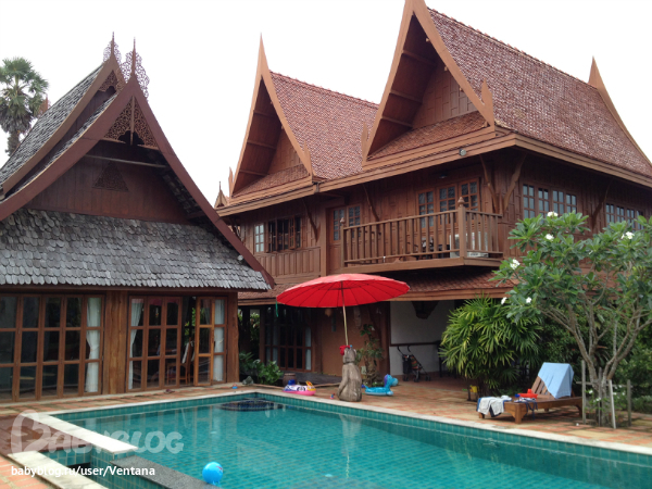 слева домик - это кухня, справа как раз комната прислуги, а между ними бассейн с рыбками