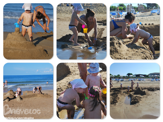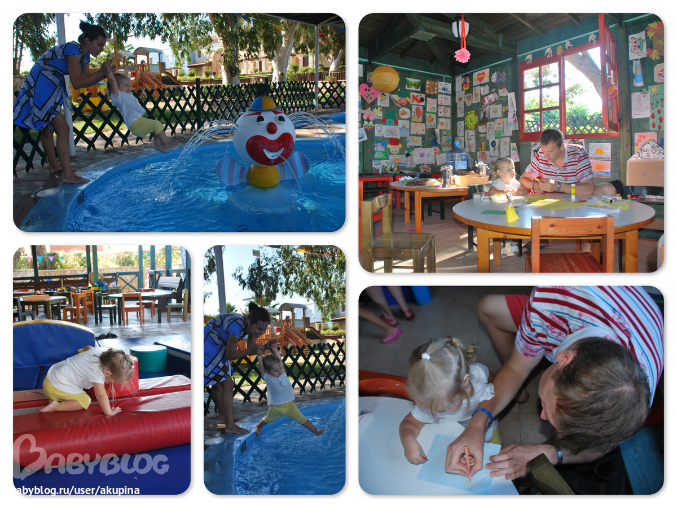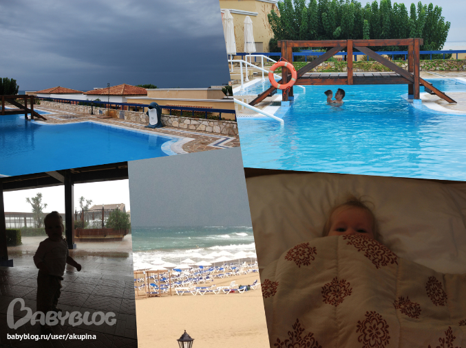 "А нам с погодой повезло, дождь идет четвертый день...." Точнее двое суток без перерыва после чего капало не так плотно. Плюшке в такой мокрой обстановке понравилось купаться в бассейне, пришлось папе составить ей компанию, а мама потом отогревала деточку под одеялом. Пляж разворотило, смельчаков поплавать в море по такой погоде я не видела ни разу. "Повезло" также и детскому центру, поэтому все варианты развлечений отпали сами собой. А еще в непогоду половина отеля на сутки осталась без света, так что мы до победного нагуливались по территории, чтобы дочь сразу же отрубилась по приходу в темный-темный номер. И как все-таки хорошо, что для кормления ребенка нам не нужно ни-че-го! Были люди, которые в панике бегали по территории, не понимая как им дальше жить в таких условиях с маленькими детьми.
