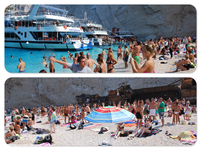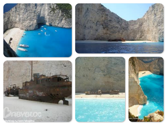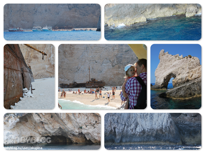 Сначала про Закинтос. На мой взгляд цена слишком завышена. Во-первых, пратически все время занимает дорога: перемещаешься на автобусе, пароме, катере; на саму цель экскурсии отводится совсем чуть-чуть. Первой точкой назначения являются Голубые гроты и пляж с затонувшим кораблем (попасть на пляж можно только со стороны моря). Вот что нашла в интернете (мои не такие прекрасные):