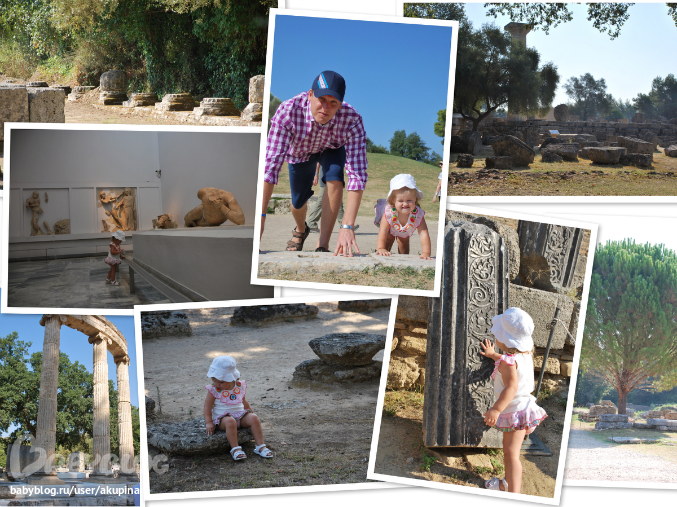 Древняя Олимпия. На развалинах можно сидеть (чем Плюшка и занималась собственно), но по ним нельзя ходить. Архитектурной красотой Олимпия не блистает, поэтому важно слушать экскурсовода - без него камушки так и останутся камушками. В центре фотография, на которой мое семейство стоит на линии старта как когда-то делали олимпийцы сейчас кааак побегут!