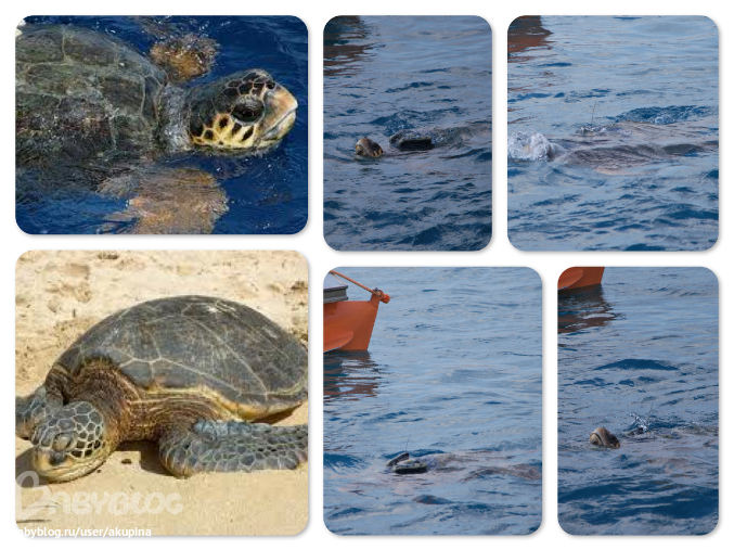 После гротов наступает время обеда (да-да, уже полдня прошло!), а потом с другой стороны острова, в бухте Лаганос, начинается "охота" на черепах. Когда мы были в Доминикане, там было что-то похожее с китами, и я предвкушала много эмоций от встречи с частичкой дикой природы. А в результате не могла отделаться от чувства жалости. Думаю, что сами черепахи готовы многое отдать, лишь бы не подниматься на поверхность за глотком воздуха в окружении моторных лодок. Слева - Каретта-Каретта так, как ее представляет Интеренет, справа то, что удалось запечатлеть нам. И да, это максимум того, что удалось посмотреть - черепаший нос на пару секунд. Моторные лодки так тесно сжимают кольцо, что не попасть в кадр для них - задача из разряда фантастики)) Видите антенну? - все черепахи помечены специальными отслеживающими устройствами. Руссо туристо, подвыпившие во время обеда, тут жеж заявили, что черепаха не настоящая верните деньги за экскурсию. Причем основным аргументом служила не столько антенна, сколько тот факт, что лодки знают, в какое место нужно плыть )))