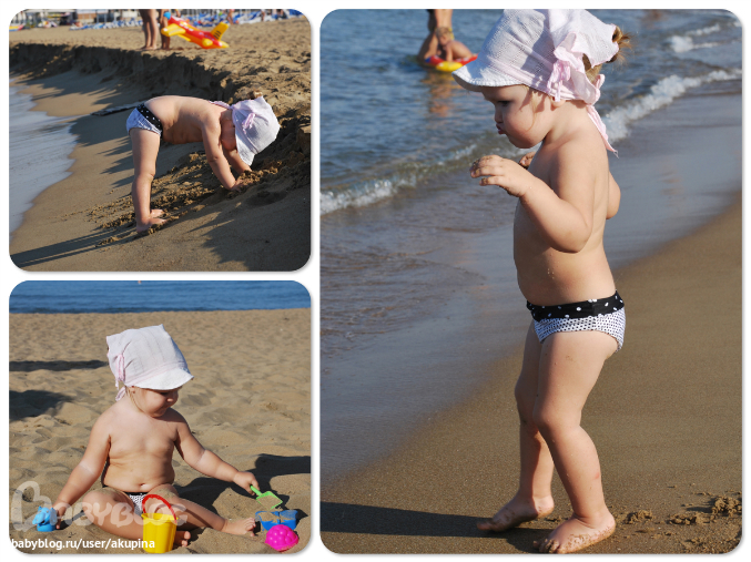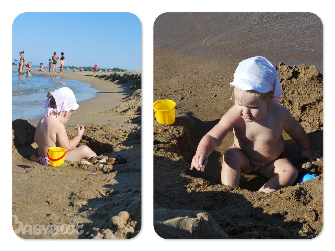 Вот она, деточка, сама идет топиться купаться - это в первые дни, пока еще с волной поближе не познакомилась. А после знакомства предпочитала песочек. Как для игры, так и внутрь - зато стул был регулярный.