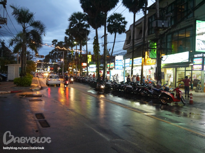 Ката выглядит так - дорога, с одной стороны дороги рестораны-кафе-магазины, а также лоточки со всякой всячиной по вечерам - так что реально даже места чтобы пройти не остается - тратуара как такового нет, с другой стороны дороги бетонная стена. Все. Отели стоят как бы в переулочках за магазинами и ресторанами. На Кароне в этом плане посвободнее...