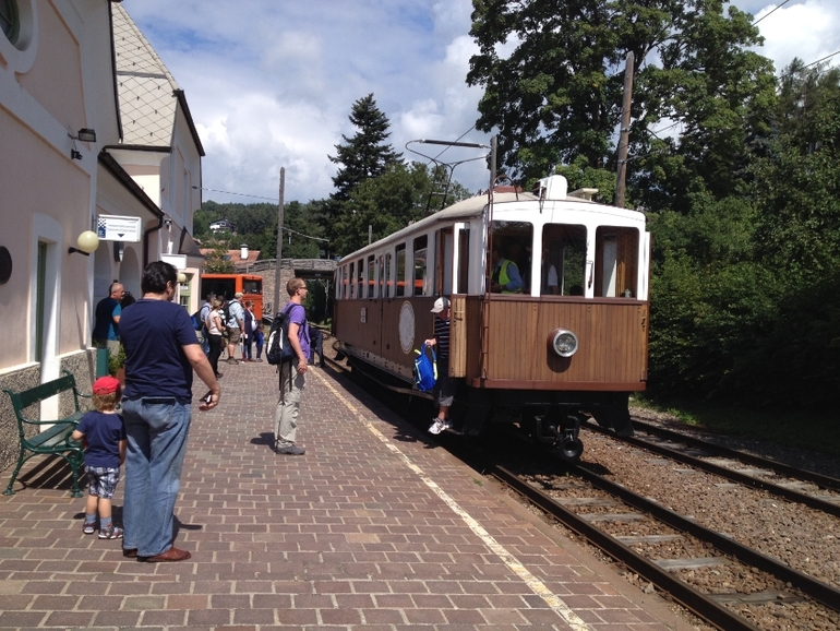 От нашего городка мы поехали на поезде до верхнего Боцана. Поезд был довольно раритетным, деревянным, и вроде года выпуска что то около 30х. Он ходит раз в день, если хорошая погода, а так по этой дороге ходят поезда чуть посовременней. Поезда- это максимум 2 вагона меньше вагона московского метро раза в 2 точно. Сама эта ж/дорога открыта была в 1911 г и поезда ходят по ней со скоростью не больше 30км в ч, и наколон дороги может достигать 45 градусов.