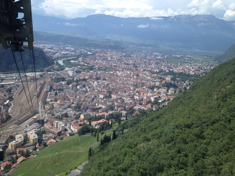 а потом , доехав до верхнего Боцана, пересаживаешься на фуниркулер и вперед...вниз... высоко , зато вид супер... а под ногами луга, дома, лисы и лани. и наконец сам Боцан.