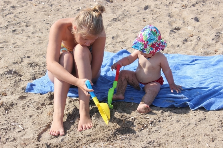 В первую неделю на пляже Любаня не слезала с рук, даже не хотела вставать босыми ножками на песок, а к морю подходить вообще боялась, но деньков через 10-12 осторожно, потихоньку, стала заходить в воду. Через месяц летела купаться сломя голову, мама еле успевала на бегу надеть нарукавники!