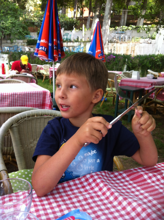 Шли мы шли и набрели на очень уютный домик-ресторанчик семейного типа - столики под зарослями алычи, домашние лепешки и овощи с огорода. Под деревьями на лужайке гамак - райское местечко. Накормить детей в поездке - особая проблема, поэтому завтрак и ужин я всегда готовлю сама (ездим только в апартаменты или квартиры с кухней), а на обед в Турции я всегда заказываю лепешки с сыром, рыбу, если есть на гриле, плов или рис, овощи или простой салат, откуда можно повыбирать, кому что нравится.