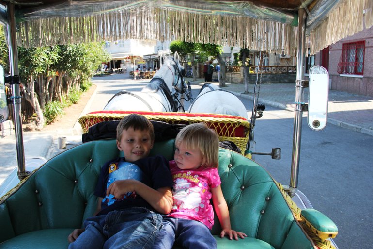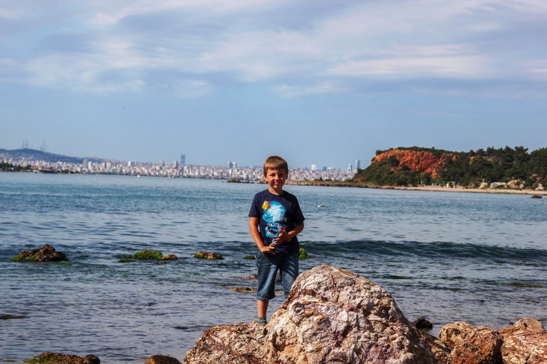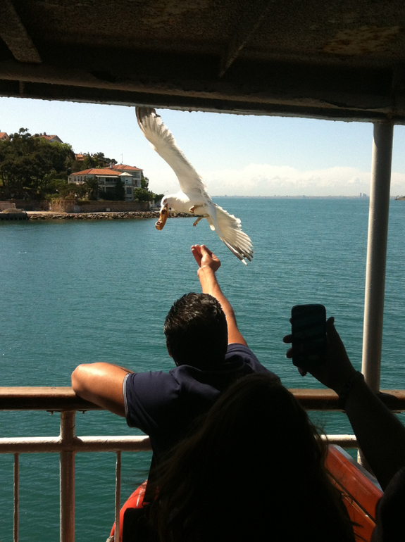 В путеводителе я вычитала, что Принцевы острова очень популярное направление среди коренных стамбульцев, не говоря уж о туристах, но такой толпы даже я не ожидала, тем более в мае! Когда подошел паром, пристань была набита битком разношерстной публикой - туристами с фотоаппаратами, подростками, турецкими дедушками (они вездесущи, как наши русские бабушки), парами с детьми. Хотя надо сказать, места хватило всем, кто-то остался сидеть на нижней палубе и на лестницах, мы же сели на второй крытой палубе и я даже укачала Дашу в коляске поспать. Милое дело под плавное качание по волнам. Дальше начались развлечения, прямо как в нашей электричке) - народ пел, играл на муз.инструментах, кто-то что-то продавал, все громко болтали, смеялись и фотографировали, в общем, жизнь кипела. Еще одно, чисто Стамбульское развлечение - кормление чаек, они толстые и наглые, еду рвут из рук, ни один кусок до воды не долетел. Зрелище захватывающее, дети в восторге.