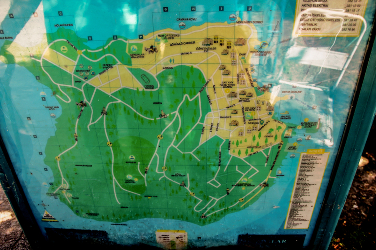 Первый остров Кыналыада, про него написано, что он наиболее тихий и спокойный, площадь около 1,65 кв.км. и что кроме вилл и особняков богатых семейств, ему похвастаться особо нечем. Следующий остров - Бургазада, площадью около 1,5 кв.км, любим турками за свои живописные виды и старинную архитектуру. На острове оборудовано несколько пляжей, правда, каменистых. Про этот остров в путеводителе было написано, что здесь расположен частный зопарк, поэтому мы решили сойти именно на нем. Остров Хейбелиада (3,24 км.), который идет следующим, известен своей кадетской школой, а про Бюйюкада самый большой (5,4 кв.км.) рассказывают, что на нем находился дворец какого-то византийского императора. У меня были сомнения, не поехать ли нам на самый большой остров, так как на нем построена действующая церковь Св.Георгия, и долгое время жил Л.Троцкий, но испугавшись возможной толпы, решили оставить этот остров на следующий раз.