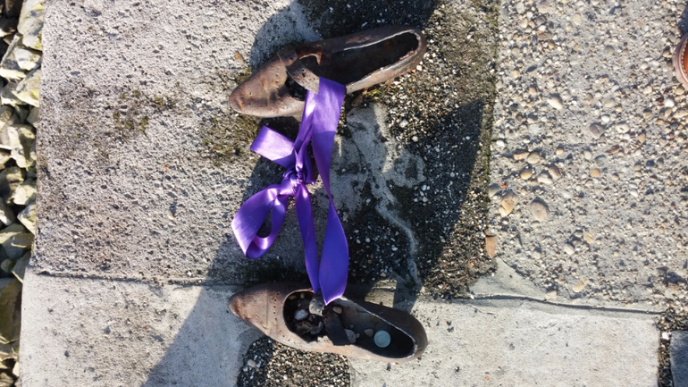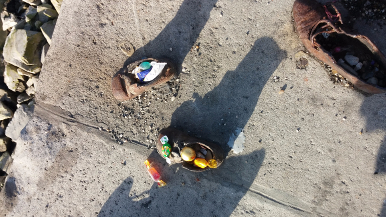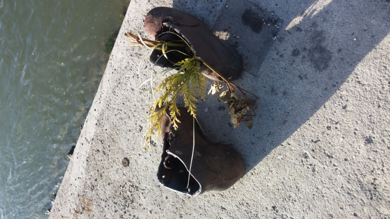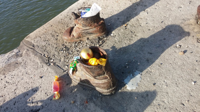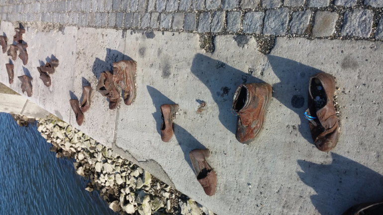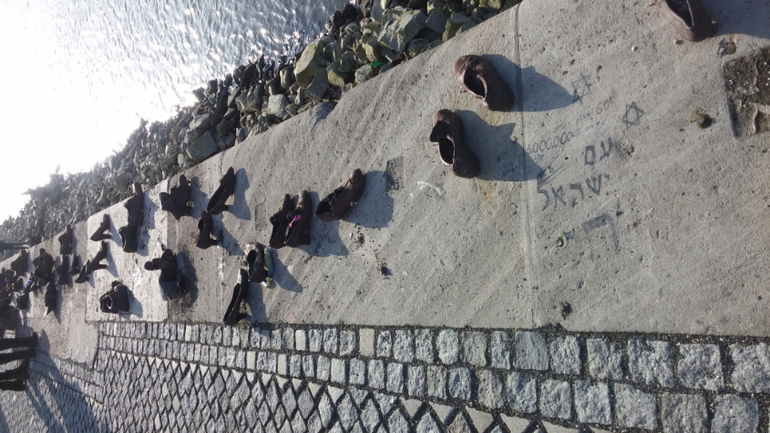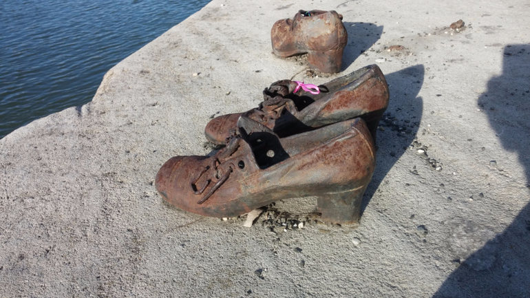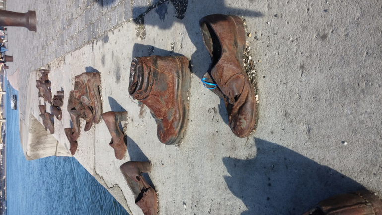 "Прямо на берегу реки стоят 60 пар обуви, отлитой из чугуна: детские ботиночки, женские туфли, мужские башмаки. Именно такими группами по 50-60 человек в 1944-1945 годах во время Второй мировой войны фашисты расстреливали евреев прямо на берегу Дуная. Причем, как рассказывают, на все 60 человек из экономии тратили только одну пулю: предварительно заключенных сцепляли колючей цепочкой, а стреляли только в первого стоящего, который сразу после получения пули падал в Дунай и тянул всех живых людей за собой. По имеющимся сведениям, до вступления в город советских войск здесь было убито примерно 10 тысяч человек!"