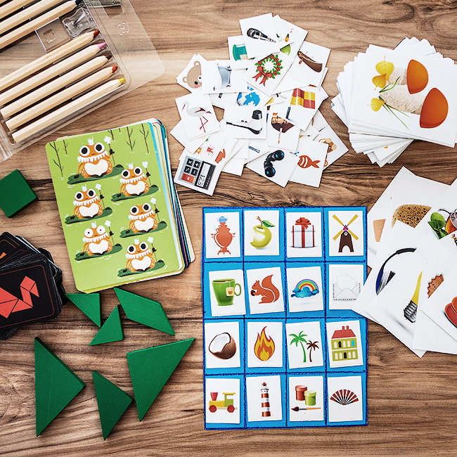 Что касается занятий, то я собрала с собой небольшой походный набор: карандаши, карточки на поиск отличий Djeco, два комплекта карточек для игры в цепочку памяти и в сетку памяти, и танграм с карточками для складывания.