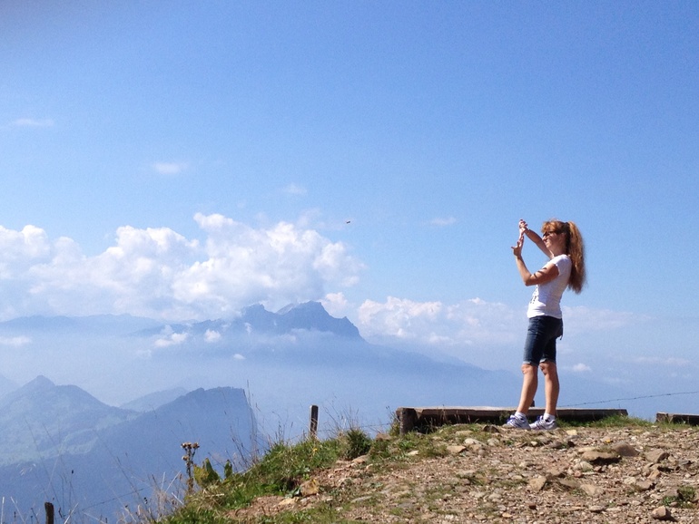 Каждый местный связывает свою страну с этой горой. Причем она ничем таким по высоте не отличается, но на этой горе проводят всякие национальные вещи, типа концертов , горнов и подбрасывания флагов вверх ( национальная забава:-))... Почти каждый побывал на Риги... Ну и мы пошли. Снегом она не была покрыта , поэтому особо стимула у меня не было... Но в горах ( кроме южного Тироля, спасибо Свете из Мюнхена) я еще не была... И короче, дав себе пинок...я отправила дете в сад и бегом на вокзал...( предварительно за месяц купив себе дешевый билет, иначе было бы дешевле за те же деньги слетать в Москву).и вот, в 8.30 я, купив кофе и гипфели ( то, что французы называют круасаном), сижу в поезде Берн-Цюрих ( ехать ровно час без остановок, если рано утром, то как селедка в бочке, 2м классом. первым тоже не сахар. но пол девятого видимо уже не утро, и я сижу между в "купе" с 3 мужиками за 60. один устроил конференцию с кем то по тел., на англ., двое других ехали куда то по делам, в Граубюнден ( города Кур, Санкт Галлен, от нас 3 часа на поезде, для местных это как из Москвы во Владивосток прокатиться) поезд, но видимо не в час пик. Проезд из Берна в Цюрих. 60 мин, стоит 50 уе , вторым классом. это для сравнения. А мне то еще дальше надо, а именно из Цюриха до Арт-Голдау, 40 минут, и вот оно счастье- еду я на чизальпино. Итальянский поезд. Такой классный. мне очень понравилось. Только остановки он не показывал и не объявлял. но у меня все получилось, я вышла где надо, и 15 лет спустя я встретила Настю. И мы пошли искать подъемник на Риги. Наш заранее купленный билет (за 45уе) позволял нам ездить по все стране на чем угодно, в т.ч. и кораблики, и даже включал в себя некоторые подъемники. ( обычно подъемники вообще зашкаливают. как пример, Юнгфрауйох ( кто смог прочитать с первого раза?) стоит 200 уе. но Риги не был покрыт снегами и не уходил за 3-4 тыс метров, и мы доплатили всего чуть чуть. и вот мы на вершине. это первое впечатление, как только мы вылезли из фуникулера.
