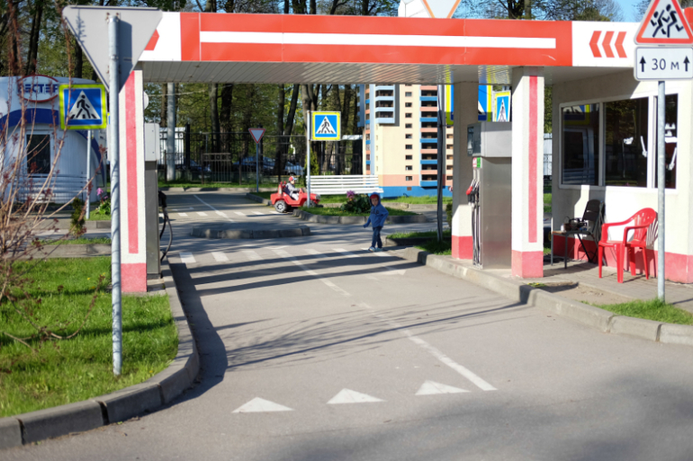 Добрались до центрального входа в парк и первый детский аттракцион - городок для детей! Можно взять машинку и ребенок будет ездить по настоящим уменьшенным улицам с магазинами, заправкой, соблюдая и правила дорожного движения. Митя чего-то испугался и просто походил по городку.