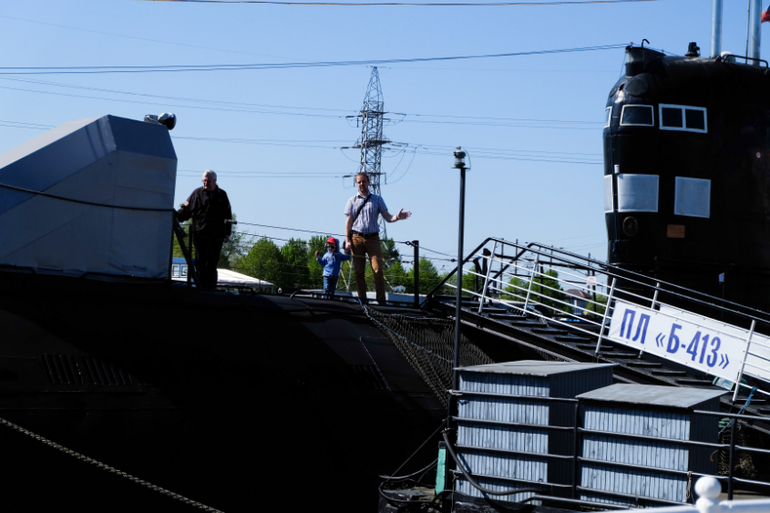 Митя с мужем поднимаются на подводную лодку, лазили по трюмам