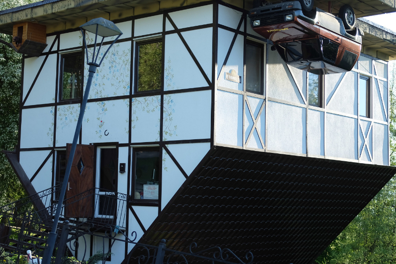 Знаменитый "Дом вверх дном", муж с сыном пошли посмотреть и выбежали через 5 минут, у обоих кружилась голова)