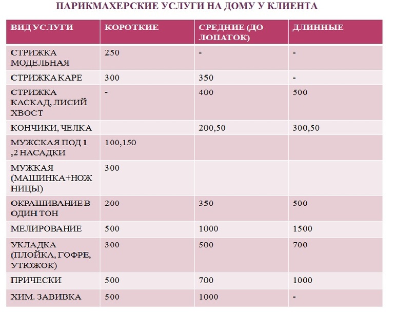УСЛУГИ ПарикмахерскиеДорогие девушки, предлагаю парикмахерские услуги с выездом к клиенту на дом.(г. Брянск) Я сама мамочка в декрете, на постоянное место выйти пока не могу, поэтому решила заниматься тем, что люблю и подрабатывать одновременно. Оказываю парикмахерские услуги людям, которые не могут надолго выйти из дома. Мой стаж уже более 10 лет, я выезжаю в любой район по городу. Цены за услуги представлены ниже, за выезд дополнительных денег я не беру, то есть сумма конечная. За подробностями обращайтесь в личку, с удовольствием отвечу на все вопросы.