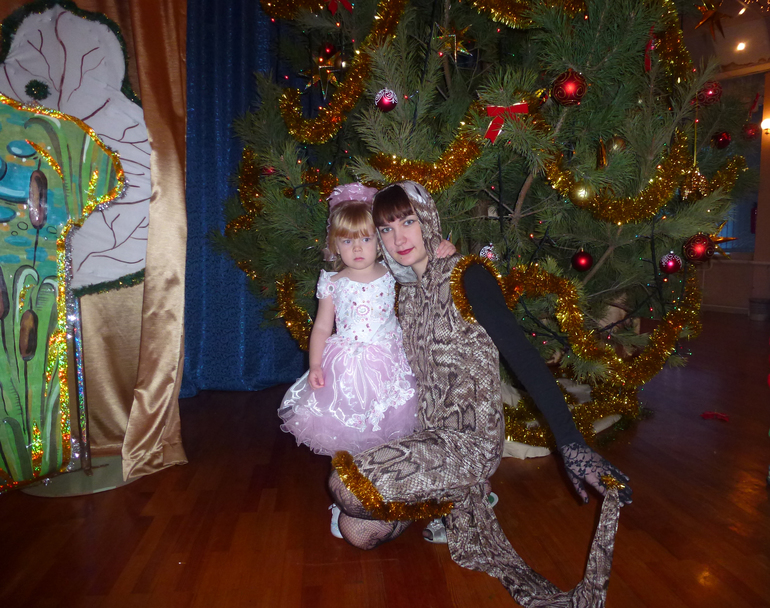 моя крайняя новогодняя елка перед декретом. Ксюнечке почти 3 года, Славушке в пузике 12 недель. Я в роли символа наступающего 2013 года - Гадючки))) В этот новый год я очень сильно болела, с высокой температурой и потерей голоса((( но все же отыграла все 36 елок!