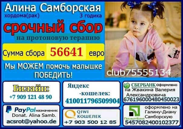 Ребята, друзья, давайте поможем ребенку кто чем сможет. Каких только слез стоит написать это слово " ПОМОГИТЕ", но иногда это единственная надежда спасти человека. Может кто-то подумает, что вот мол, у меня нет много денег и та сумма которую я могу перечислить не спасет никого, то вы ошибаетесь! Если бы вы знали как иногда выручает один рубль. Давайте поможем ребенку, ведь каждая перечисленная копейка воспринимается не как деньги, а как еще одна маленькая надежда на спасение!