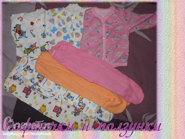Хорошенькие вещички, я вчера выбралась покупать а выбора то особо нет , прмя расстроилась :( сил уже нет ходить по магазинам но паника берет свое и сегодня пойду снова , я не уивдела у вас антицарапок, не нужны думаешь ? и еще по советам подруг лучше покупать на первое время ползунки и распашонки отдельные а не слипами, потому что когда в РД идешь мыть ляль снимаешь низ и моешь, а верх остается, а слип приходится снимать полностью. Я взяла и так и так