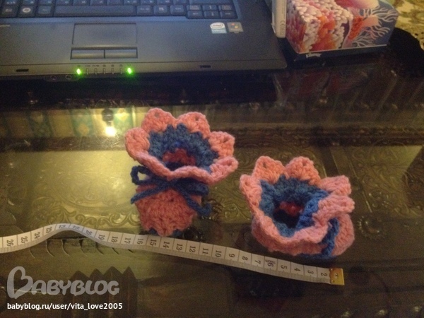 Так как давно не вязала,пришлось перевязывать, а думала как раньше, за пару часов сделаю, но не тут то было!)) Строго меня не судите, так как еще рано, чтоб узнать пол малыша,то я решила сделать из розовых и синих ниток,совместить так сказать!))) Ещ если успею,хочу бисер довязать на окантовке!!)))) Такие масенькие получились!!!!)))