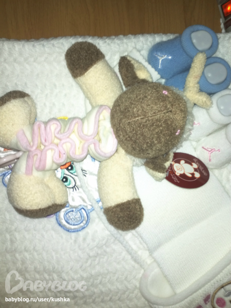 Или на теплое время, одежда на выписку, теплая шапочка, носочки и первая игрушка купленная специально купленная для нас в подарок