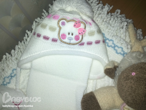 Теплая шапочка в идеале искала чисто белую, но маленького размера нашла только такую)