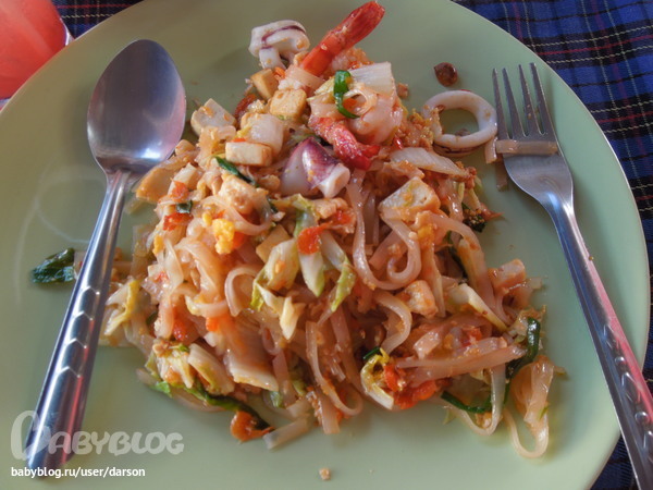 Мой врач меня спрашивал, что я буду, там есть. У многих Таиланд ассоциируется с острой едой, это действительно так, острое здесь в почете, но вы всегда можете заказать, что-то не острое и добавить перец по вкусу. Мы предпочитаем ходить в кафе с местной кухней, где едят сами тайцы. Но есть пара кафе, где владельцы итальянцы и французы, там тоже предлагают местную кухню, но в почете больше пицца и сендвичи. Понятно, что этого добра у нас и в России хватает. Два самых распространенных блюда это, жареный рис с морепродуктами или курицей или патай ( это рисовая лапша) так же с курицей или морепродуктами.