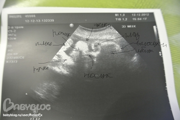 Узистка сказала, что редко когда малыш так поворачивается и смотрит, глазки открывает. На голове уже волосики есть, и вообще головка у нас уже большая - 8,5 см, соответствует 34,3 неделям беременности, длина бедреной кости - 6,3 см, окружность живота - 28,3 см. Положение занял правильное, головкой вниз, ножки прямо под ребрами. Однозначно сыночек, показали яички, правое уже полностью опустилось, левое еще дозревает.