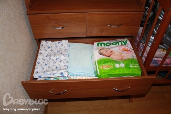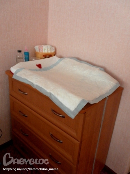 От себя рекомендую приспособить под чистые подгузники какой-нибудь подходящий контейнер, я взяла от мороженки)) Справа от пеленальника - пачка салфеток, рядом с комодом у стенки стоит ведерко с пакетом)) А под пеленальником приклеила широким скотчем сантиметровую ленту, получился ростомер) Все удобно и под рукой-)