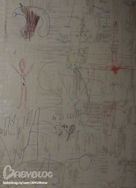 А так все хорошо. Старшенький пошел на поправку и на больничном стало даже хорошо!)) Никто не закашливается и незахрюкивается соплями, играем, смотрим мультфильмы, готовим обедики и ужины. Сейчас вот пойдем сухарики делать))) А еще, в ожидании ремонта, Дениска рисует на обоях в большой комнате))) Почти все уже покрыл наскальной живописью) Кусочек попал в фото, пока животик запечатлевала: