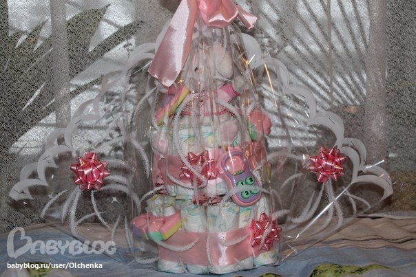 Первые вещички правда уже есть. Коллега подарила торт из памперсов,игрушек и вещичек)